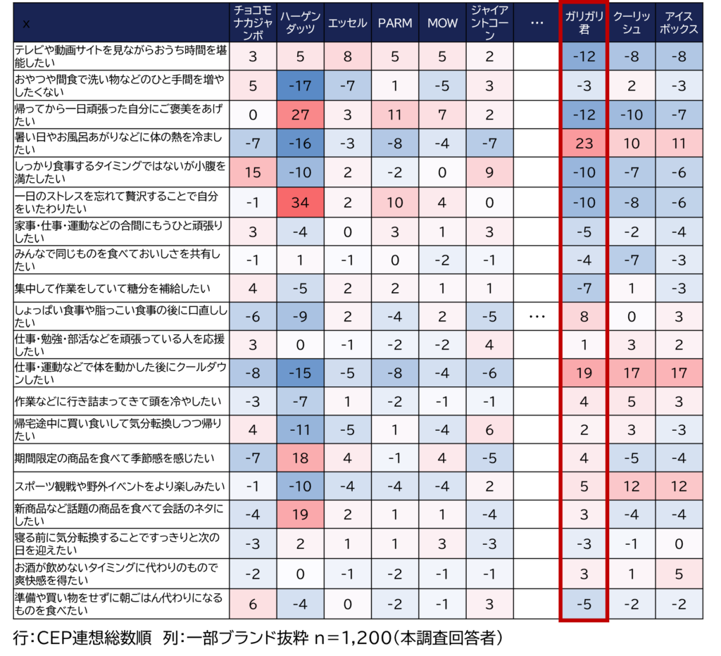 各CEPにおける自社の「メンタルアドバンテージ」を、統計的な期待値との差分から定量化します 。イメージ調査では見えない想起の偏りを明確に可視化します 。あわせて、間口の広さ、利用額、習慣強度を評価するポテンシャル分析を実施 。ボリューム成長と利益率を重視する文脈を切り分け、次に攻めるべき「伸びしろ」のあるCEPを科学的に特定します。